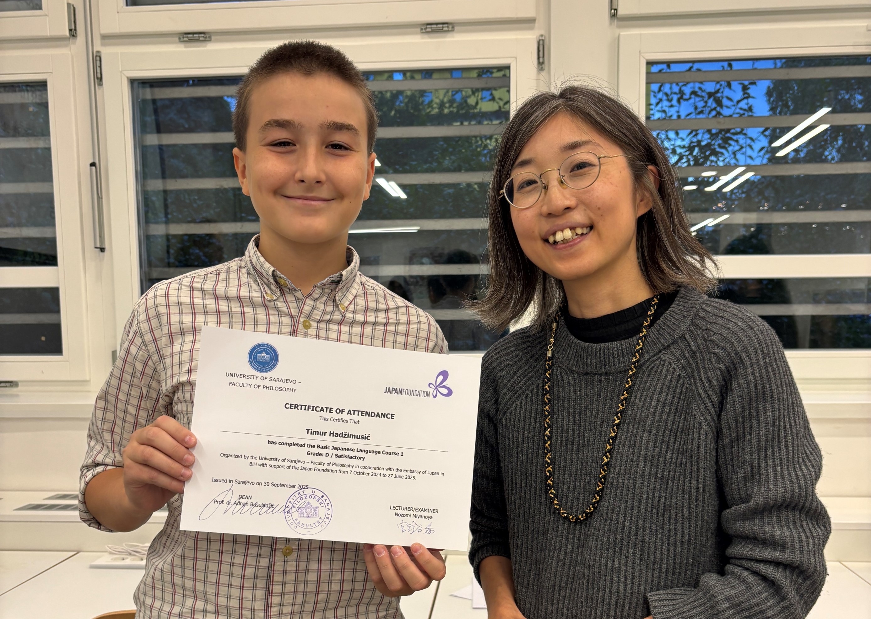 "Učenje japanskog možda nije lako, ali se nadam da ćete svi postati mostovi koji povezuju Japan i Bosnu i Hercegovinu", naveo je ambasador u svom pozdravnom govoru, a na kraju ceremonije je učenicima uručio certifikate za uspješan završetak kursa.