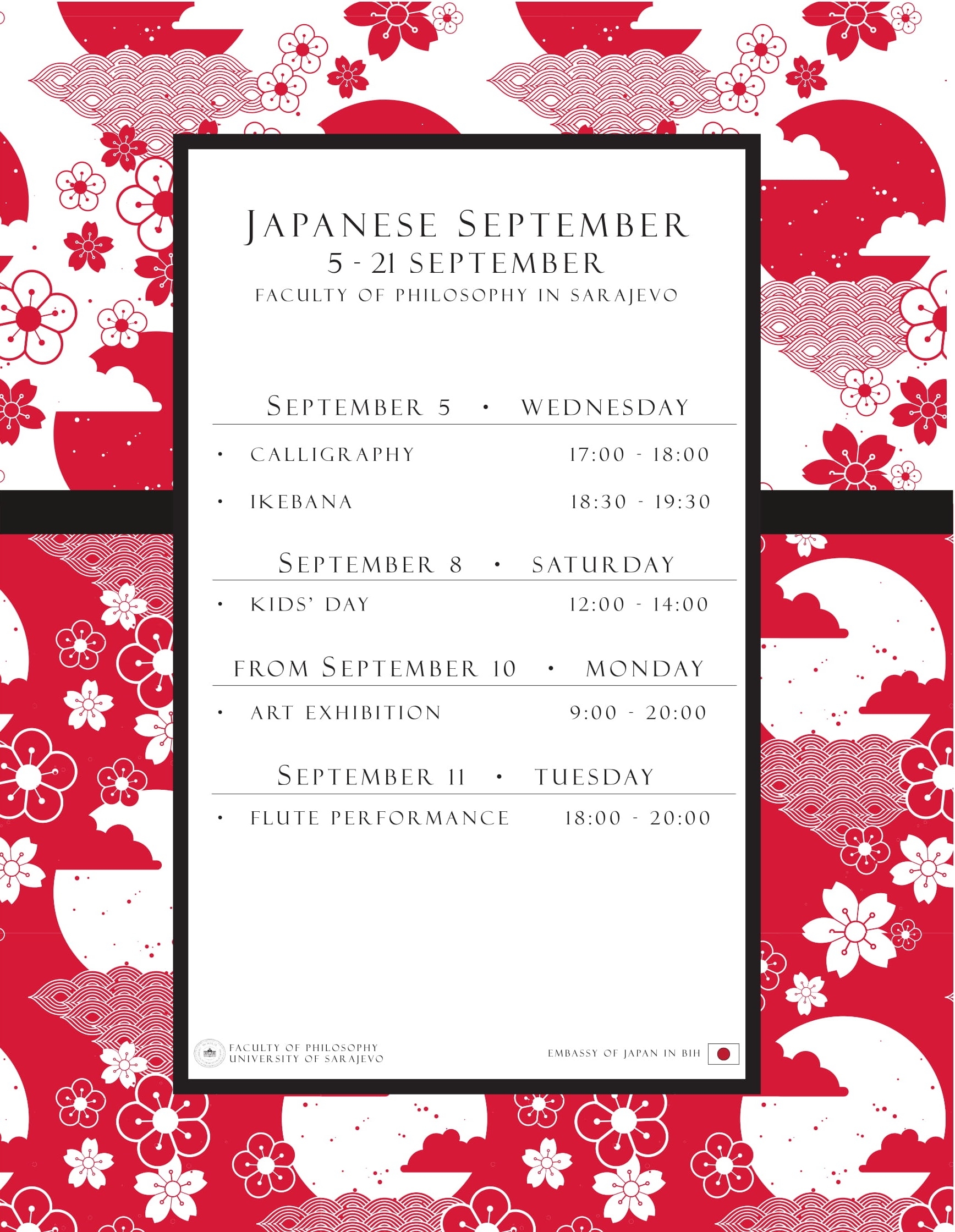2018年9月5日から21日の期間,サラエボ大学哲学部において,日本文化に特化したイベントが数々行われる「ジャパニーズセプテンバー」が開催されます。主なイベントは以下のとおりです。入場は無料です。皆様のご来場をお待ちしています。