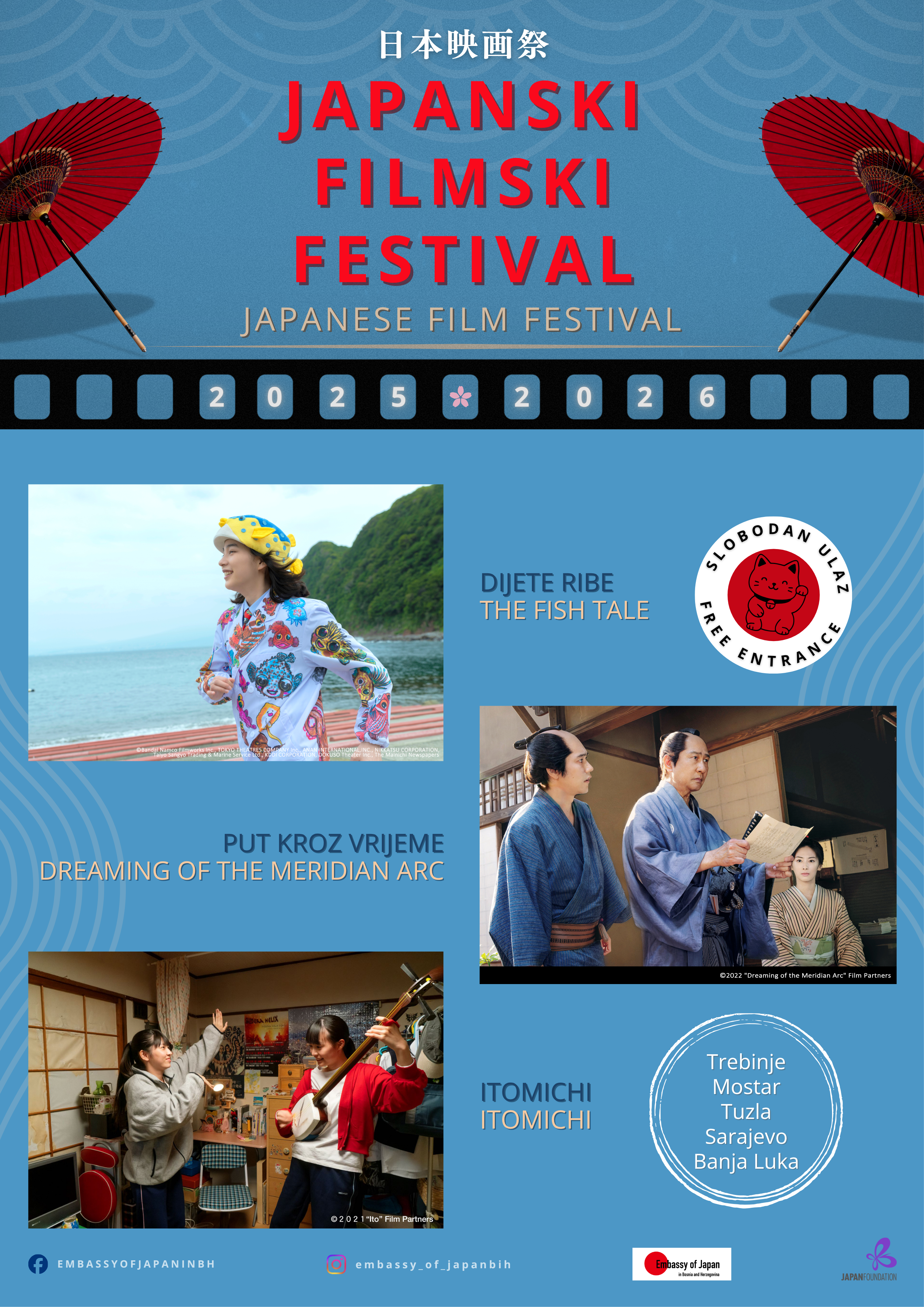 在ボスニア・ヘルツェゴビナ日本国大使館は、国際交流基金および当地の映画館と共催し、2025年11月13日(木)から2026年2月6日(木)にかけて、トレビニェ、モスタル、トゥズラ、サラエボ、バニャルカの5都市で日本映画祭を開催いたします。ご家族、ご友人などと共にぜひお越しください。入場は無料です。現代の日本社会を反映した3本の映画をご覧いただけます。